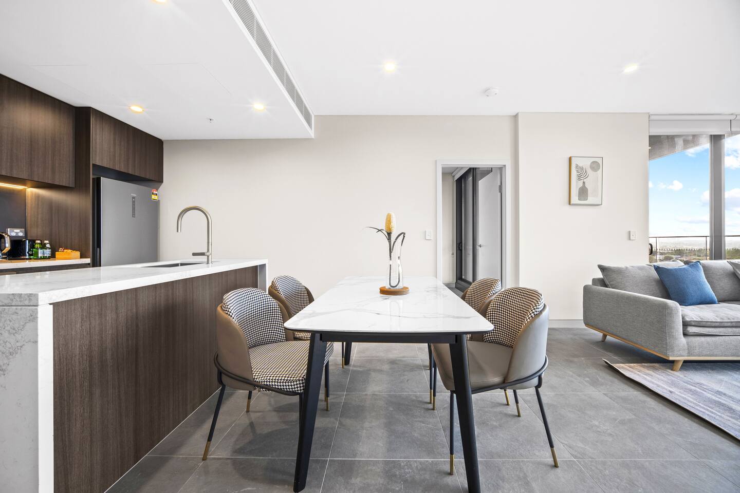The apartment fits comfortably up to 5 guests with 2 queen beds in 2 bedrooms and a single bed in the study area, two modern bathrooms, living room, modern kitchen and self contained laundry. The apartment comes with one free onsite parking, and visitors' parking Free unlimited high-speed Wifi with a 50'' smart TV for family and friends to stream Youtube, Netflix, Stan or Apple TV, Spotify, etc. with your account logged in. 2 Bedrooms: * 2 queen size bedrooms * Built-in wardrobe contains coat hangers and shelving. * Two bedside tables with 2 lamps on each side * Single bed in the study area with single bedside table. 2 Full bathroom * Walking Shower in the ensuites * Tub/Shower in the second bathroom Living Room: - 50'' Smart TV Stream Netflix and Youtube - Modern sofa - Coffee table Kitchen: Our well-equipped kitchen has a built-in fridge, electric oven, gas cooktop, cooking utensils, kettle, fridge, dishwasher, toaster, and basic pantry supplies. Balcony: Next to the rooftop garden. Laundry: Complete with a washing machine and dryer. Laundry detergent is available for you to use. Building facility *Gym * Some complimentary items will be provided to make your stay as homely as possible.