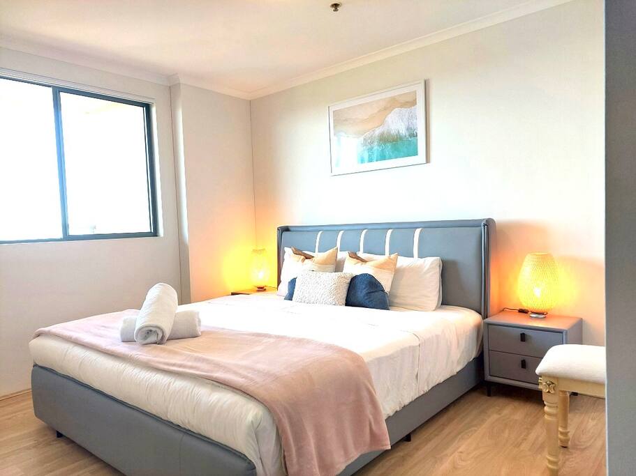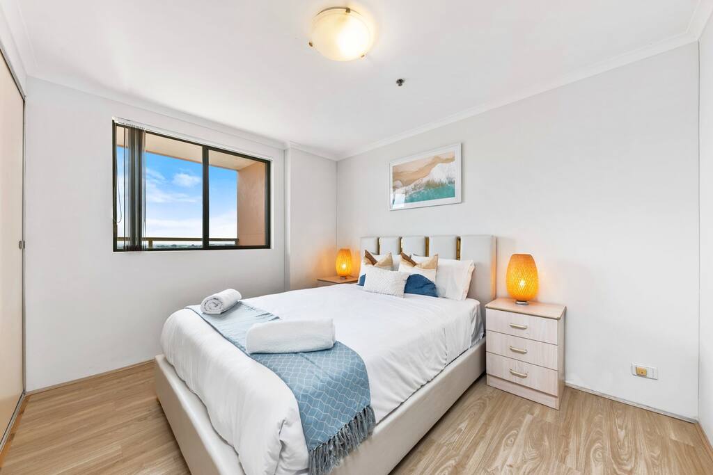 The apartment fits comfortably up to 6 guests with queen bed in the rooms and one modern bathrooms, you'll enjoy the high privacy that my apartment has offered. Free unlimited high speed Wifi with 50'' smart TV for family and friends to stream movie and music. En-suite Bedroom: 。 A queen size bed 。 Built-in wardrobe contains coat hangers and shelving. 。 Two bedside tables Living Room: 。50'' Smart TV Stream Netflix and Youtube 。3 seater sofa bed 。Coffee table Kitchen: Our well-equipped kitchen has an electric oven, microwave, gas cooktop, cooking utensils, kettle, fridge, dishwasher, toaster, and basic pantry supplies. Balcony: 。Dining table with six seats 。Two rock chairs for you to relax Laundry: Complete with a washing machine and dryer. Laundry detergent is available for you to use. Parking: Free secured onsite parking
