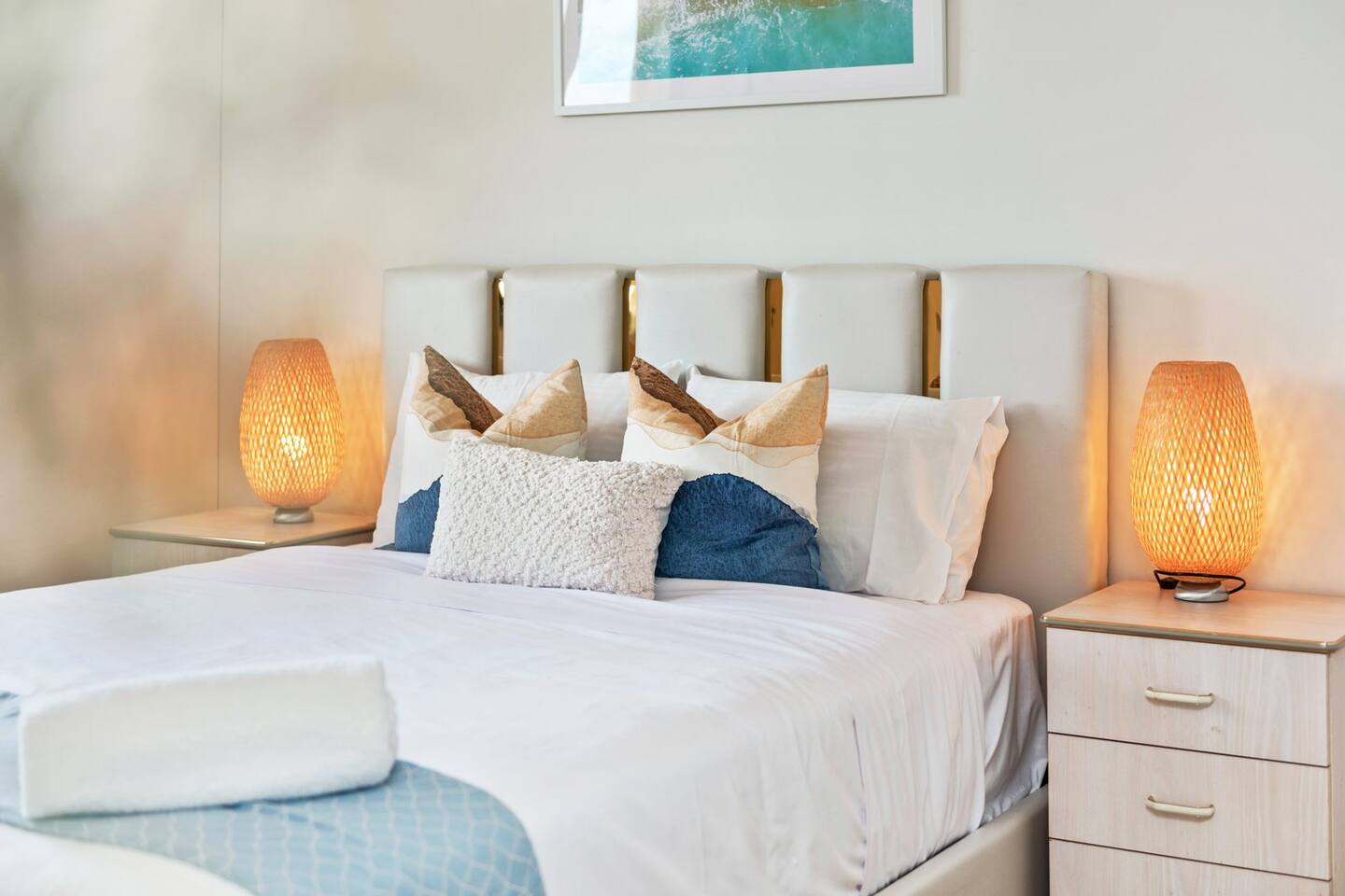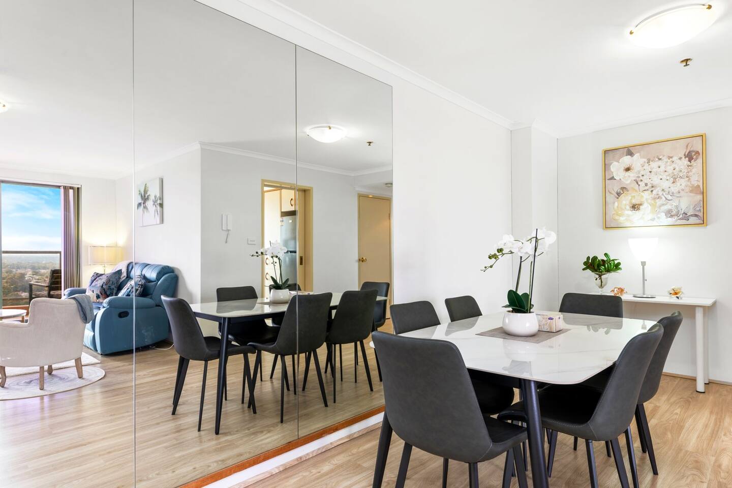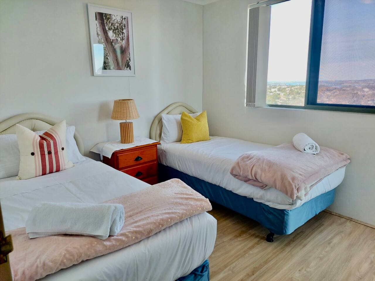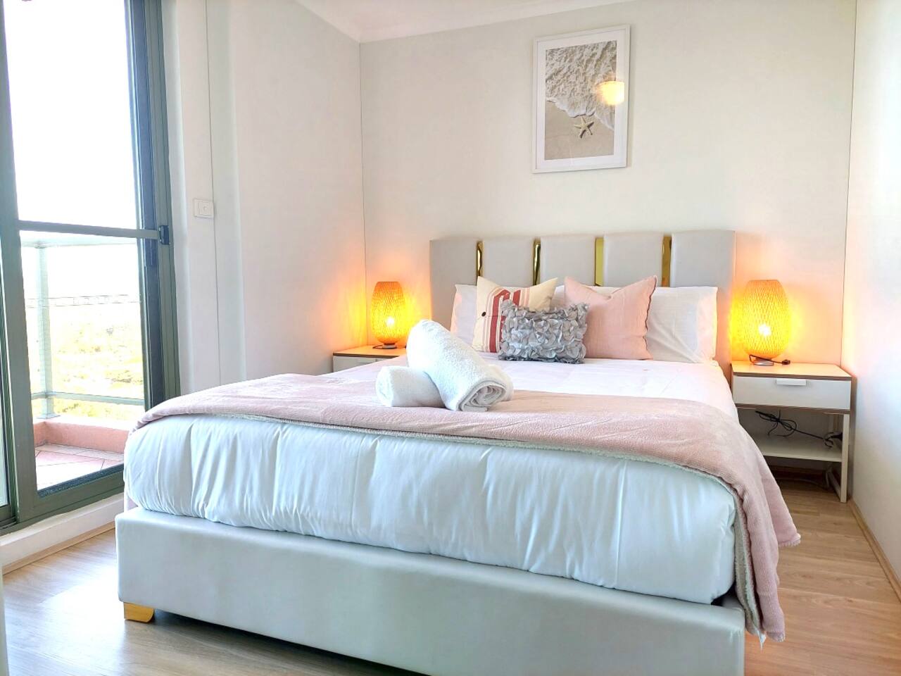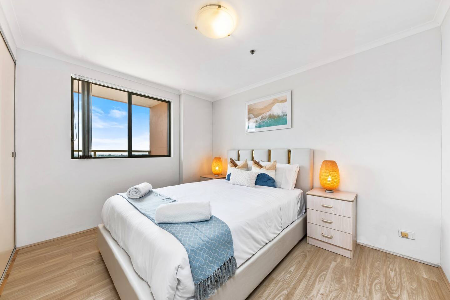 The apartment fits comfortably up to 6 guests with queen bed in the rooms and one modern bathrooms, you'll enjoy the high privacy that my apartment has offered. Free unlimited high speed Wifi with 50'' smart TV for family and friends to stream movie and music. En-suite Bedroom: 。 A queen size bed 。 Built-in wardrobe contains coat hangers and shelving. 。 Two bedside tables Living Room: 。50'' Smart TV Stream Netflix and Youtube 。3 seater sofa bed 。Coffee table Kitchen: Our well-equipped kitchen has an electric oven, microwave, gas cooktop, cooking utensils, kettle, fridge, dishwasher, toaster, and basic pantry supplies. Balcony: 。Dining table with six seats 。Two rock chairs for you to relax Laundry: Complete with a washing machine and dryer. Laundry detergent is available for you to use. Parking: Free secured onsite parking *AC only on living room